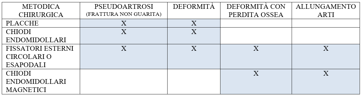 Per il trattamento chirurgico delle deformità degli arti vengono utilizzate tecniche chirurgiche, che permettono di correggere le deviazioni assiali, di sostituire la perdita di segmenti ossei ed eventualmente di allungare gli arti.